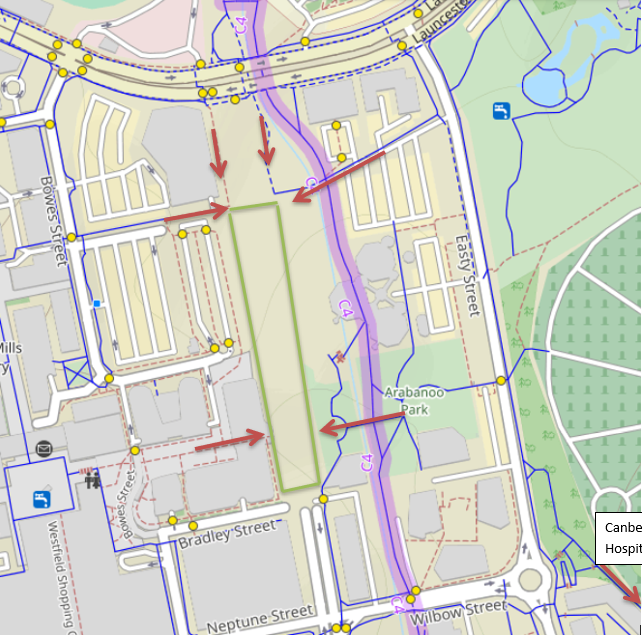 Access from the Hospital and Garran and from the south on the C4 is a bit clunky, via the wooden bridge in Arabanoo Park and over the C4. Access from the south via Callum St looks tricky.